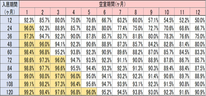 稼働率=入居期間÷(入居期間+空室期間)で計算します(下図 稼働率表早見表参照)。
